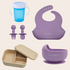 Dieses Set ist die perfekte Wahl für aktive Eltern und neugierige Kleine. Es enthält einen praktischen Saugnapf, ein weiches Silikonlätzchen, Kleinkinderbesteck, einen 360°-Becher und eine praktische Lunchbox. Perfekt für zu Hause, auf Spaziergängen oder unterwegs – alles, was Sie für bequemes, selbstständiges Essen brauchen.