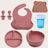Das Set enthält einen Teller mit Fächern, eine Saugnapfschale, Löffel und Gabel, einen 360°-Becher, ein Silikonlätzchen mit Tasche und eine Matte in Teddybärform. Diese praktische Kombination aus allen wichtigen Accessoires hilft Ihrem Kind, selbstständig essen zu lernen.